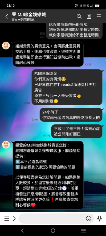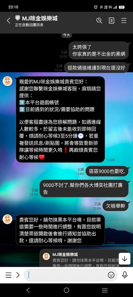 從我申請提款到現在已經整整超過 24 小時了,這期間我找了多少次客服?得到的答案永遠只有那套爛劇本,說什麼「提款管道維護中」、「第三方金流系統異常」。最好是有這麼剛好,全台灣的銀行都在維護?還是只有你們家咪金的錢包特別爛,一天到晚都在維修?講白了,這就是最典型的娛樂城詐騙手段。先用這種爛藉口拖延時間,心裡想的就是看玩家會不會因為錢拿不出來,心煩意亂之下就把那筆錢又拿去投注輸回去。如果你意志堅定不肯輸回去,你們就開始耍流氓、裝死,這不是黑網是什麼?