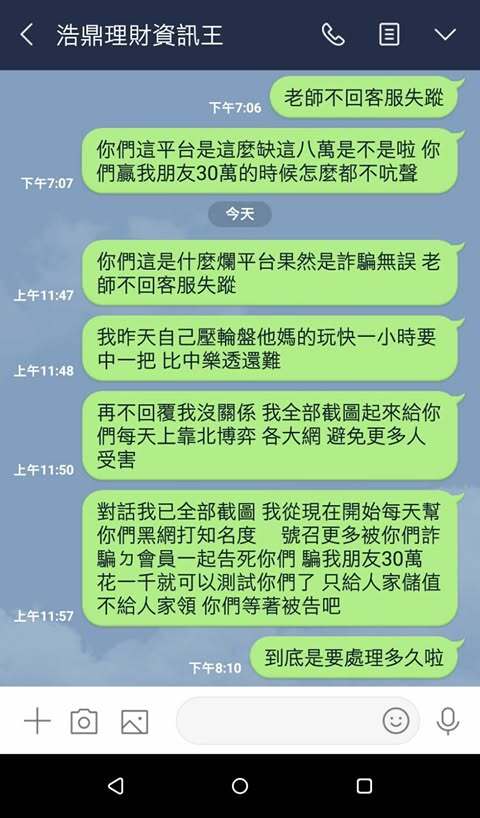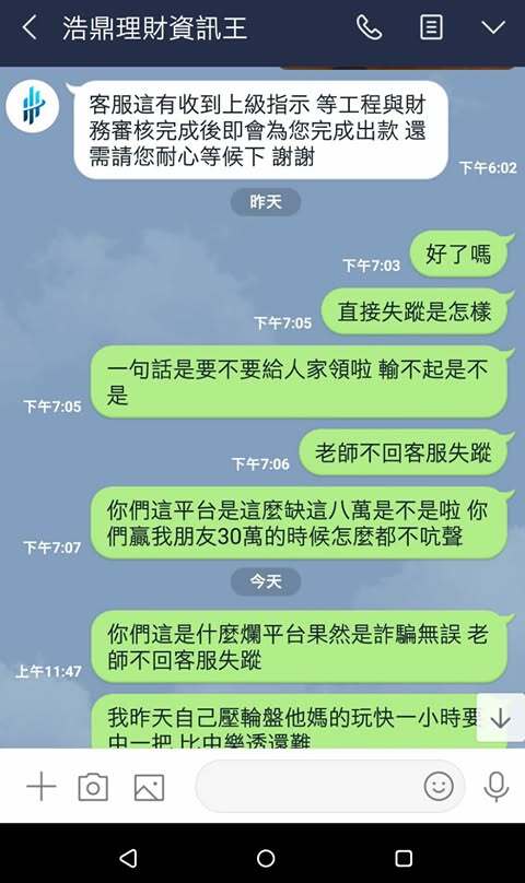 後來我決定測試看看,我先儲值1000元,讓他們帶單操作,結果竟然真的贏到8萬元。這時我就說我要先出金測試,如果能正常領到,我才會考慮再儲值50萬。結果事情果然跟我想的一樣,當我要申請提款時,平台開始各種理由拖延,不是說審核中,就是說系統維護,後來甚至直接不回訊息。客服消失、老師也不見,整個就像人間蒸發一樣,到現在錢都還沒拿回來。